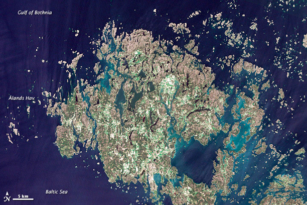 The Åland Islands (also known as the Aaland Islands) lie at the southern end of the Gulf of Bothnia, between Sweden and Finland. The archipelago consists of several large islands and roughly 6,500 small isles, many of them too small for human habitation. Åland vegetation is a combination of pine and deciduous forest, meadows, and farmed fields. On nearly every island, however, the region’s characteristic red rapakivi granite appears.