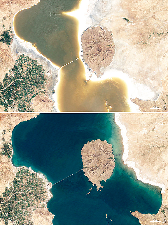 A study published in 2007 concluded that both drought and increased demand for irrigation water contributed to the lake’s falling water levels and rising salinity. The study cited growing populations in the surrounding area and the consequent need for potable water. To assess Orumiyeh’s water levels in the 1990s and 2000s, the study relied on satellite observations from the Thematic Mapper and Enhanced Thematic Mapper Plus sensors on Landsat satellites. Amin Eimanifar, lead author of the 2007 study, remarks that water levels have dropped throughout the lake (follow the high-resolution links above for wider views). Eimanifar describes Orumiyeh as a “hungry saline lake,” and further remarks, “As it has important features in the world of saline lakes, it is our duty to give it value and protect it.”