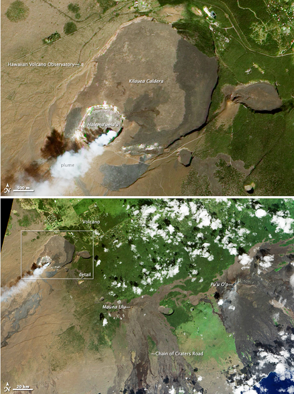 January 2012 marks the 100th anniversary of the Hawaiian Volcano Observatory, which stands watch over one of our planet’s most active volcanoes. Situated on the rim of Kilauea Caldera, this observatory is the oldest volcano monitoring station in the United States. The Advanced Land Imager (ALI) on NASA’s Earth Observing-1 (EO-1) satellite observed the volcano on January 28, 2012. Shown here are two natural-color views: a close-up of the Kilauea Caldera and the Hawaiian Volcano Observatory, and a wide-area view showing Mauna Ulu and Pu’u ’O’o. Within the Kilauea Caldera lies Halema’uma’u Crater. A small plume of water vapor emerges from this crater and blows toward the southwest.