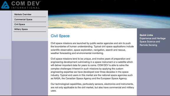Michael Pley, CEO of COM DEV, said, “Our U.K.-based division supplied electronics and imaging equipment for a European meteorological satellite, while our international products group provided passive microwave components for a U.S. commercial communications satellite. It’s this range of capabilities that has enabled COM DEV to fly equipment on more spacecraft than any other company in the world.”