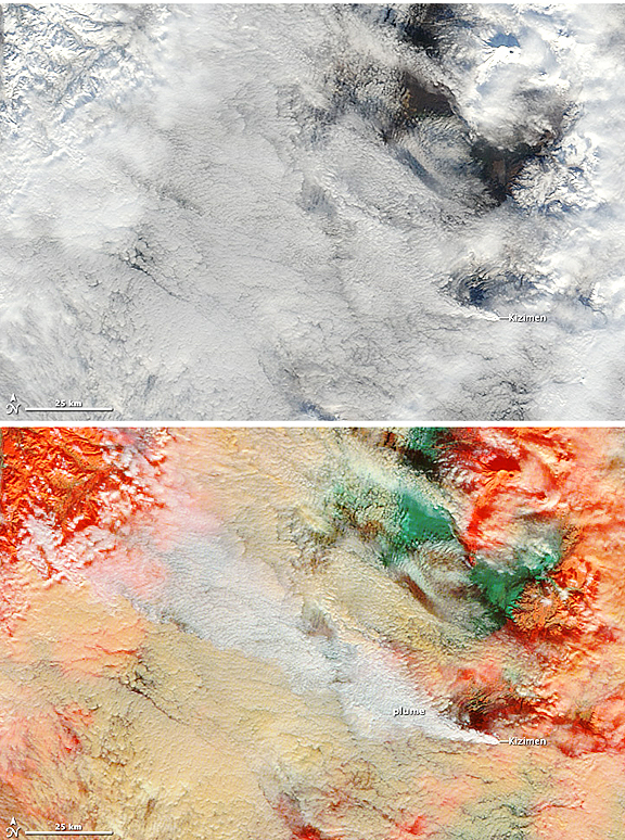 …emit gas and ash. The Moderate Resolution Imaging Spectroradiometer (MODIS) on NASA’s Terra satellite captured these natural-color (top) and false-color (bottom) views of the continuing eruption on November 1, 2012. Though the plume is difficult to detect in the true-color image, it shows up clearly in false-color because of the different combination of bands used to create the two images. In the false-color image, snow and ice appears bright red and vegetation looks green.