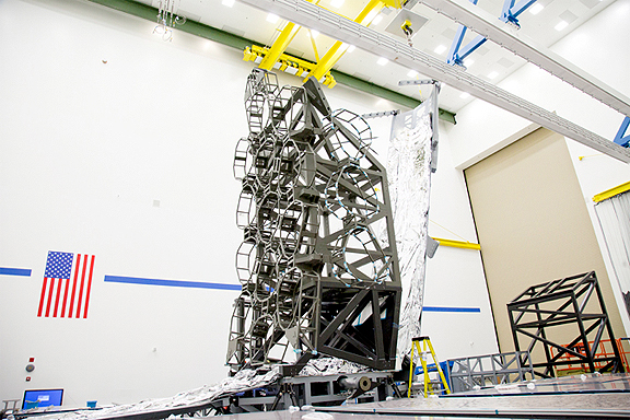 …fold around the observatory while stored in the rocket that would take it to its orbit a million miles from Earth. Engineers at Northrop Grumman Aerospace Systems in Redondo Beach, California, installed the first of five template sunshield membranes on a Webb telescope mock-up. The mock-up is a full-scale structural facsimile of the real observatory. Installing this first sunshield template membrane gave engineers a real-world understanding of how the sunshield will fold up and wrap around the observatory to stow it for launch before it unfurls in space. Engineers at Northrop Grumman recently verified that key folded membrane features that are critical to stowage and deployment align correctly with the hard structure of the observatory.