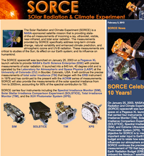 Scientists who study the Sun and Earth’s environment use SORCE data in conjunction with other measurements to track and analyze the connection between solar changes and atmospheric or climate changes on Earth. The SORCE science mission and the instruments aboard the spacecraft were conceived, designed and built by LASP. The project’s funding and oversight is provided by NASA’s Goddard Space Flight Center.