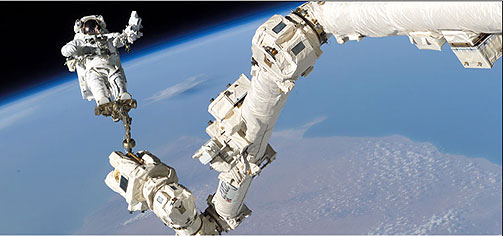 Mission STS-114 was known as “The Return to Flight”, being the first shuttle launch since the Columbia tragedy. Among its many tasks, Canadarm2 assisted astronauts during their spacewalks. In this image, NASA astronaut Stephen Robinson is held aloft by Canadarm2 during the crew’s third spacewalk. (Credit: NASA)