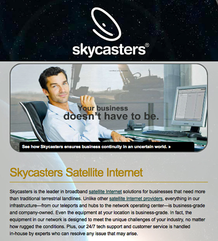 “Choosing the iDirect Evolution platform was a natural choice for us,” says Skycasters President Mike Kister. “We are committed to staying on top of cutting edge technology to provide the very best performance over a wide range of conditions. The Evolution platform allows us to provide greater bandwidth efficiency which translates into improved service for all of our customers.”