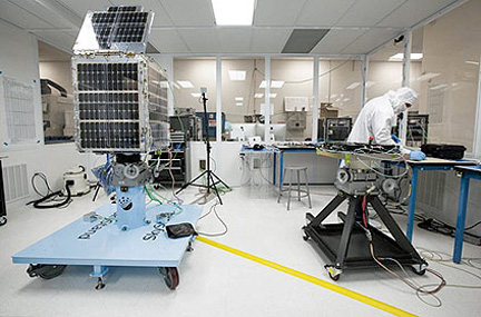 SkySat-1 (left) is in final testing phases and SkySat-2 (right) is proceeding through electrical integration.