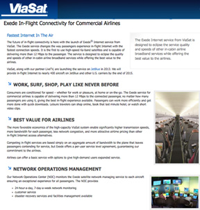 The Exede In The Air in-flight service for commercial aircraft is designed to eclipse the service quality and speeds of other in-cabin airline broadband services. The major differentiator for Exede services is an innovative Ka-band satellite system, featuring ViaSat-1, the world’s highest capacity communications satellite. The more favorable economics of the ViaSat system enable airlines to specify a high-speed service level to each passenger, rather than simply an aggregate amount of bandwidth to the plane that leaves passengers competing for limited resources. The system is capable of delivering 12 Mbps or more to each connected passenger.