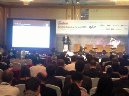 [SatNews] With the SatNews publisher and sales director in attendance at CommunicAsia2013 in Singapore, one of the major, opening day’s events was the Satellite Industry Forum on Monday. Pictured here, courtesy of SatNews Publisher’s head honcho, Silvano Payne, is Andrew Jordan, the CEO of Eutelsat Asia, opening the full conference.