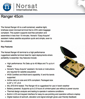 The Norsat Ranger 45 microsat fits within a weather-tight, briefcase package (overhead luggage compliant). Key features include: