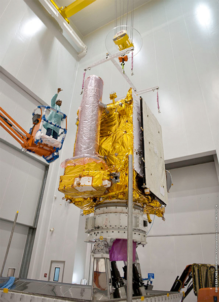 GSAT-7 has now begun its checkout at the Spaceport to confirm the multi-band satellite’s readiness with payloads in the UHF, S-band, C-band and Ku-bands. Developed by the Indian Space Research Organisation, it utilizes India’s standard I-2K bus—the same as employed for the Indian INSAT-3D satellite, which is only hours away from liftoff on Arianespace’s VA214 mission. The GSAT-7 spacecraft’s mass at liftoff is estimated at 2,550kg., and its power handling capability is rated at approximately 3,000 Watts. After being deployed by Ariane 5, the satellite will operate from an orbital position of 74 degrees East.