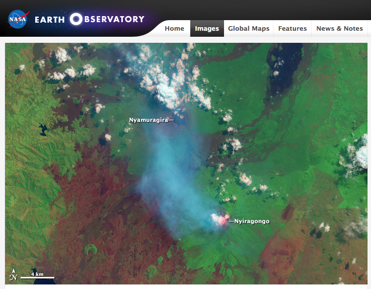 Nyiragongo features a persistent lava lake, revealed by the red glow of shortwave infrared* light. A translucent blue volcanic plume stretches north from Nyiragongo, partially shrouding Nyamuragira.