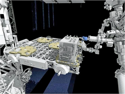 This artistic representation shows ISS’s Dextre robot (right) performing a robotic refueling task on RRM (center), mounted to ELC4. Image courtesy of NASA.