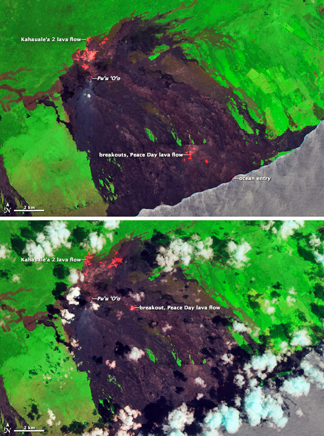 This pair of satellite images shows the lava flows in false-color (combining shortwave infrared, near infrared, and green light) on August 9, 2013 (top), and September 7, 2013 (lower). The hot surface of the flows radiate shortwave infrared light, which appears red in the images. Green indicates vegetation. Rocky lava flows (up to 50 years old, too young for significant regrowth of vegetation) are black. Clouds are white or bright blue-green.