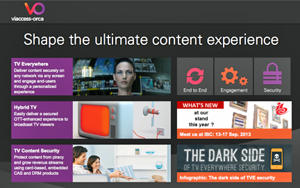 [SatNews] Viaccess-Orca will demonstrate a new user interface for its TV Everywhere (TVE) solution at IBC2013, stand 1.A51.