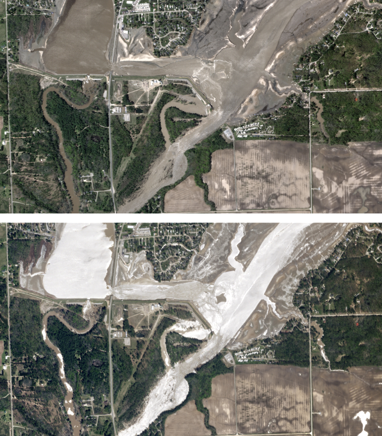 The first SkySat image (taken in the morning) and second SkySat image (taken in the afternoon) were collected on May 20, 2020, and show the remains of the Edenville Dam, breached after heavy rainfall over Michigan. The silvery appearance of the water in the morning is due to sunglint, which is the reflection of light directly into the satellite’s telescope. © 2020, Planet Labs Inc.