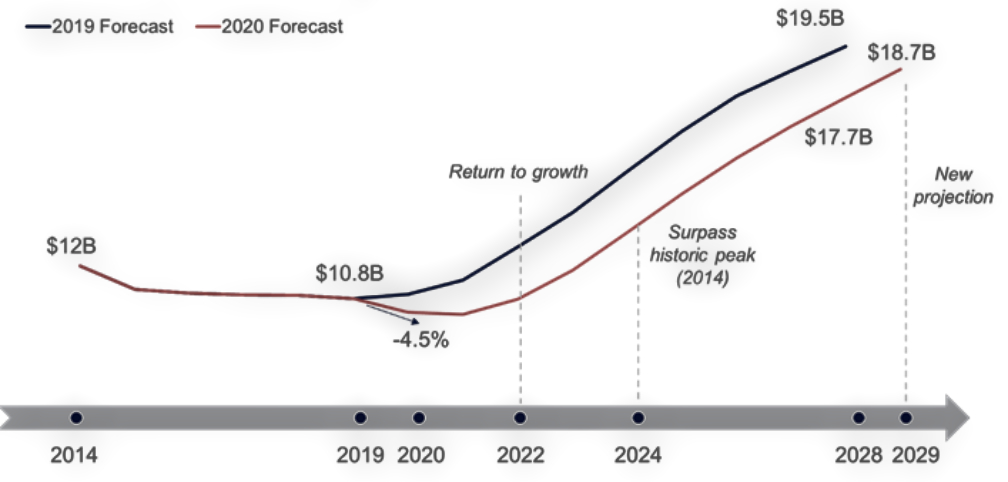 According to Euroconsult’s forecast, the satellite and connectivity market is now expected to surpass its historic revenue peak by 2024 and will become an $18.7 billion market by 2029.