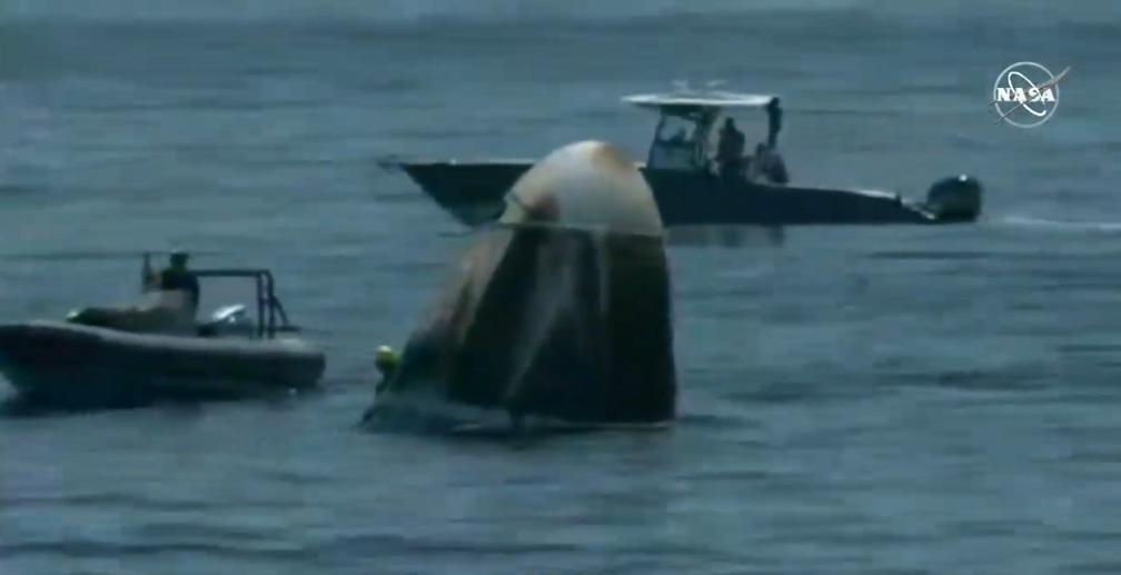 The SpaceX Dragon capsule with astronauts Behnken and Hurley aboard has completed its descent from space and into the Gulf of Mexico for a successful splashdown, completing this historic mission to and from the International Space Station.
