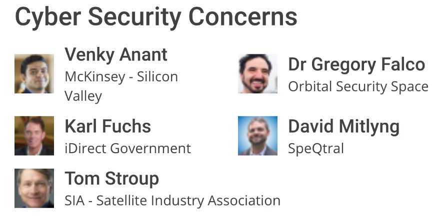 The session entitled Cyber Security Concerns featured Tom Stroup of the Satellite Industry Association (SIA) as the moderator with panel participants Dr. Gregory Falco of Orbital Security Space, Venky Anant of McKinsey-Silicon Valley, Karl Fuchs of iDirect Government, and David Mitlyng of SpeQtral.