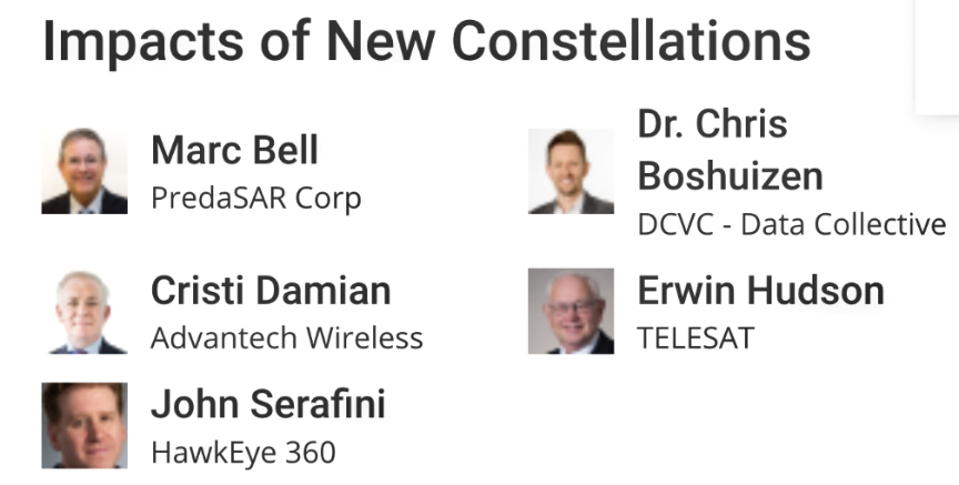Dr. Chris Boshuizen of DCVS – Data Collective — was the moderator for this session with panelists Marc Bell of PredaSAR Corporation, Cristi Damian of Advantech Wireless, John Serafini of HawkEye 360 and Erwin Hudson of Telesat.