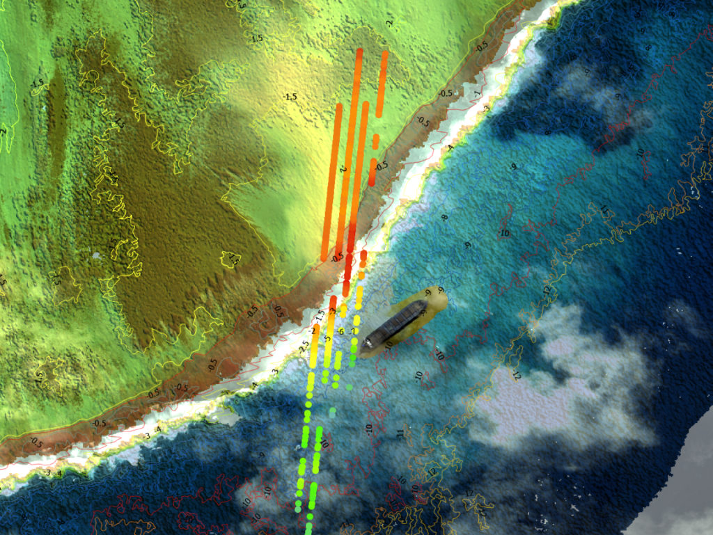 - WV Wakashio grounding & Oil Spill – In the immediate aftermath of the Indian Ocean shipwreck off the coast of Mauritius, TCarta acquired Maxar WorldView-2 satellite imagery over the poorly charted area and applied the new ICESat-validated SDB method to map the seafloor. The bathymetric data sets were published via web mapping service and made freely available through Esri’s ArcGIS Online and Maxar’s SecureWatch platforms.