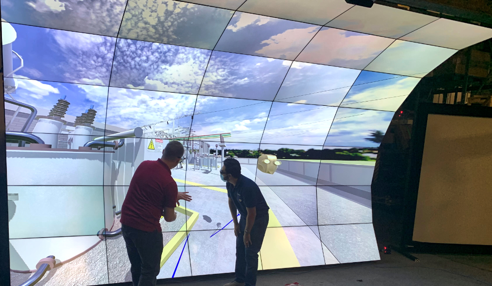 The immersive display is made up of 35 high-resolution LCD panels that are both 2D and 3D capable, mounted on a curved, half-pipe framework. For virtual reality viewing, users wear movie-style stereoscopic glasses that create realistic depth perception. A lead researcher wears glasses with optical motion trackers that are monitored by precision cameras. As the researcher moves within the display, the position and orientation of their head is accurately tracked and used by the computer to present the correct perspective of the spatial data in real time.