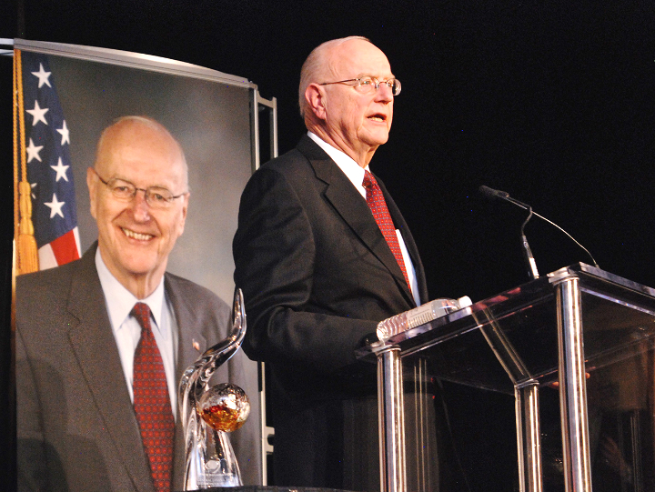 It was for these efforts and more that he was selected by Space Foundation’s board of directors in 2009 as the recipient of the organization’s highest honor, the General James E. Hill Lifetime Space Achievement Award, at the 25th Space Symposium. Presented annually, the Hill Award recognizes outstanding individuals who have distinguished themselves through lifetime contributions to the welfare or betterment of humankind through the exploration, development, and use of space, or through the use of space technology, information, themes, or resources in academic, cultural, industrial, or other pursuits of broad benefit to humanity. In each of these categories, Peter Teets was an exemplary example.