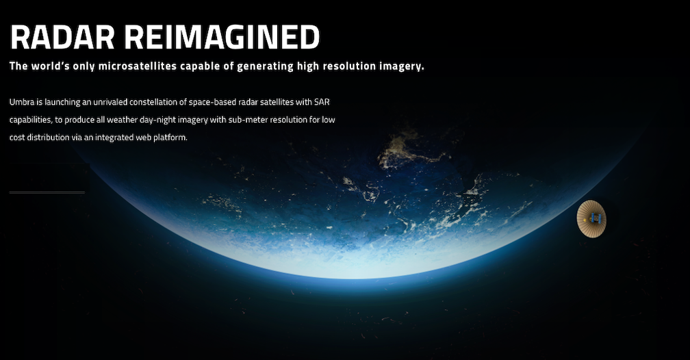 Umbra invented the only microsatellite that can see through clouds, at night, in high resolution (<25 cm GSD). Umbra has agreements to deliver data to the United States government and commercial geospatial intelligence (GEOINT) firms.