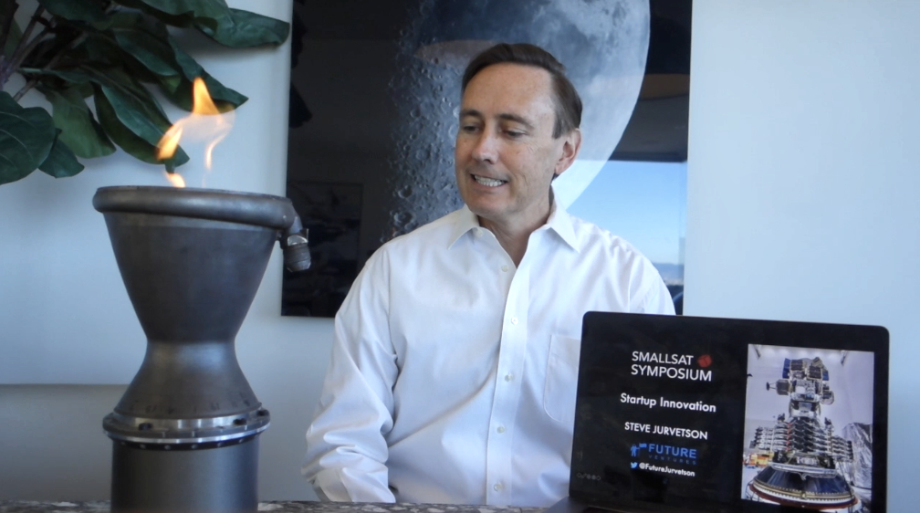 With an Astra 3D printed engine all fired up to his left, Steve Jurvetson of Future Ventures presented his keynote presentation during the first day of the SmallSat Symposium.
