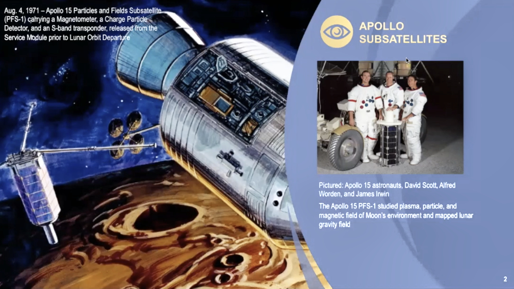 NASA is doing amazing science with smallsats. First, a little history. We are all aware of the Apollo missions to the moon in 1971. What is not so well known is that the Apollo 15 and 16 missions deployed smallsats at the command module as it left lunar orbit. Here (image below) you can see one of the satellites that flew. It carried three instruments: a magnetometer, a charged particle detector and an S-band transponder. It made a number of important measurements… plasma, particle and magnetic field of the Moon’s environment and mapped the lunar gravity field.