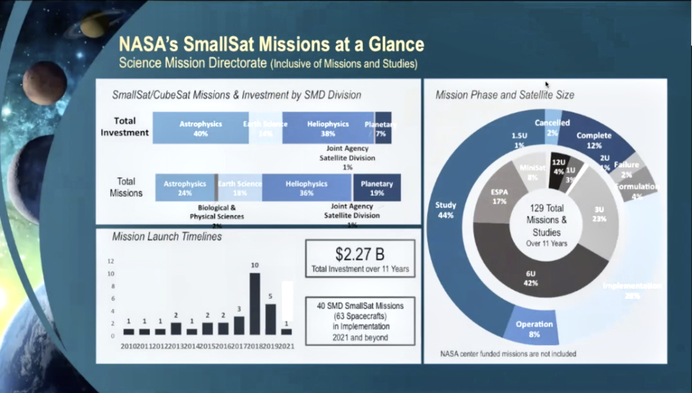 The next two charts are going to be a synopsis of some of our science missions. As our Associate Administrator for Science said, “These missions do big science but they are special because they come in small packages, which means you can launch them together and get more research for the price of a single launch.”