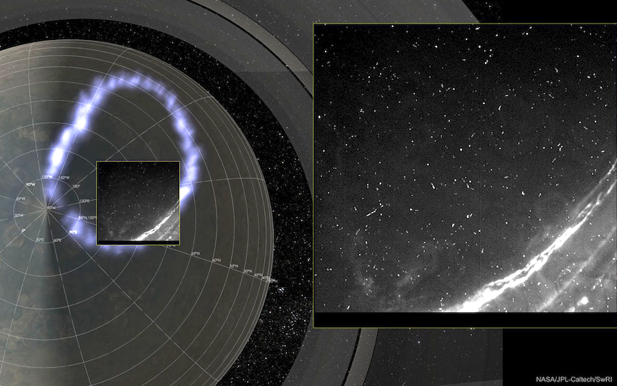 The featured image, taken by Juno’s Stellar Reference Unit camera on 2018 May 24, shows Jupiter’s northern auroral oval and several bright dots and streaks. An eye-catching event is shown in the right inset image — which is a flash of Jupiter’s lightning — one of the closest images of aurora and lightning ever.