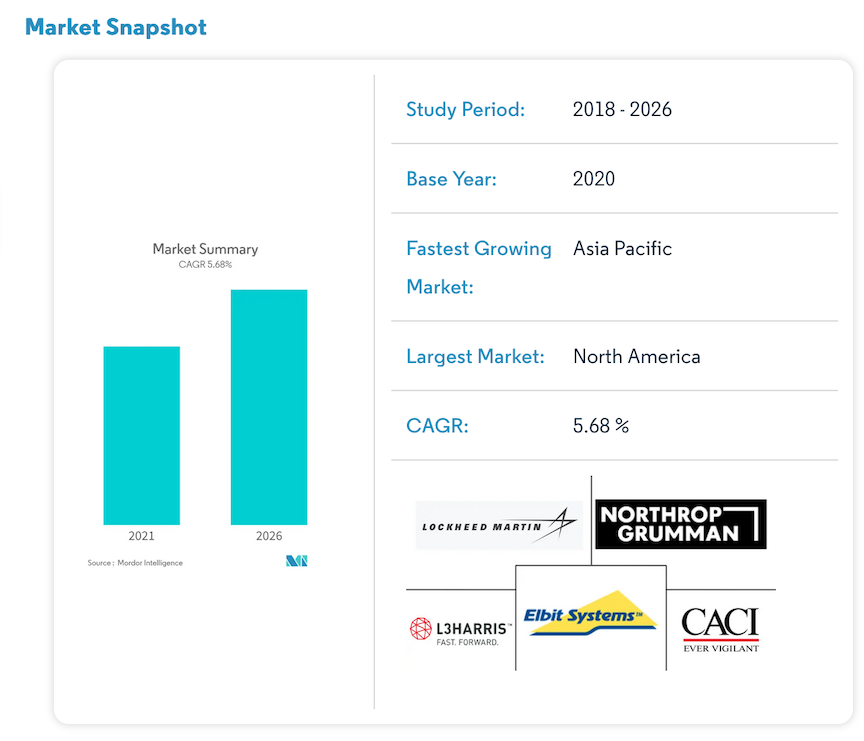 With space-based communication, reconnaissance, and navigation systems playing an ever-increasing role in ensuring the success of military operations, satellites have become a key target for EW systems. Major defense spending countries are consistently investing on EW modernization and field a variety of new EW systems to augment the capabilities of all service branches. Some EW systems are aimed at jamming and spoofing communications user terminals and GPS receivers within a local area while some other jammers are designed to interfere with the satellites themselves, affecting services for all users in the satellite reception area. India’s Defense Space Agency is looking for technology to deal with threats in and from space. The agency has been in talks with different companies to procure the said technology since 2020 and issued the RFI in January 2021. The agency is looking for a system that can be enhanced to play an offensive role in the future. Thus, the increasing adoption of electronic warfare is expected to drive the demand for sophisticated C4ISR systems and fuel the growth of the market in focus during the forecast period.