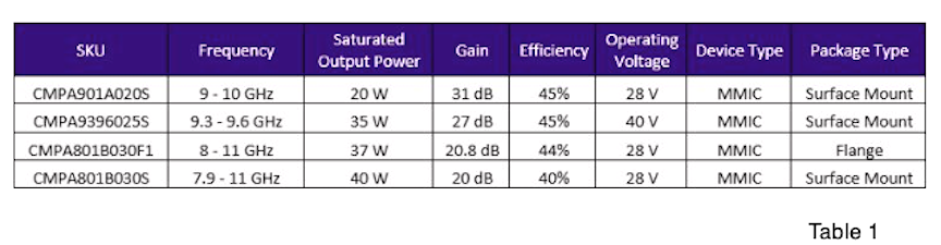 The extensive X-band portfolio offers solutions that support multiple stages of gain, thereby reducing the number of devices needed in a transmit chain. They come in a variety of power levels to optimize system performance and are offered in multiple platforms to optimize system architecture. See Table 1 for more product details and performance data.