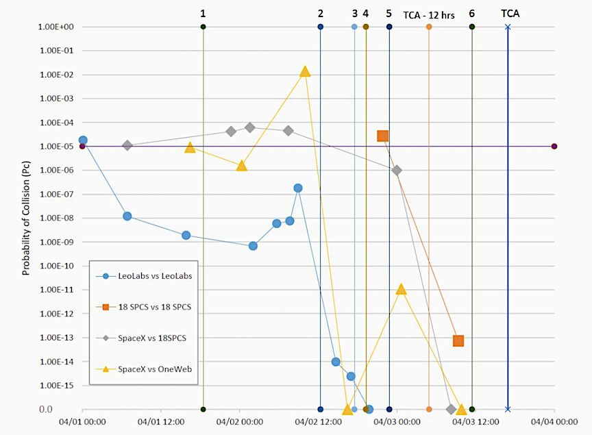 This sounds a little like a PR battle, but both sides may have been sincere because satellite tracking is imprecise. The satellites were being tracked by SpaceX, OneWeb, and two independent organizations, the Air Force 18th Space Control Squadron (18 SPCS) and LeoLabs which offers a commercial satellite tracking service. As we see in the plot shown below (source), their estimates of the probability of collision vary.