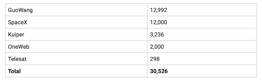 The SpaceX-OneWeb and astronaut-debris events provide an early warning. There are around 3,000 satellites in LEO today, but how about five years from now? As shown below, the five would-be broadband constellation operators have the authorization to launch over 30,000 satellites and, if we add in pending requests for approval, the total increases to around 100,000. Furthermore, Russia and the European Union are working on broadband satellite plans, as are the US and Chinese militaries. And don’t forget the forthcoming large non-broadband constellations, like Geely’s Geespace constellation.