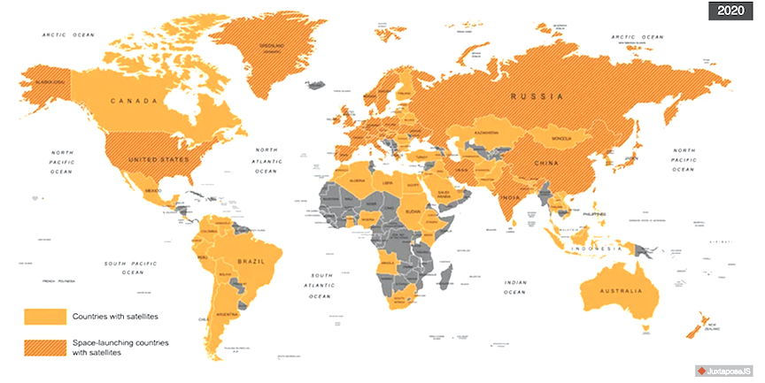 The map below shows that 72 nations own and/or operate satellites, but last week, English-speaking engineers at SpaceX and OneWeb were unable to agree on the orbit data and communicate and cooperate when it appeared that a collision might be forthcoming. If SpaceX and OneWeb cannot agree, what will happen when, for example, military satellites from China and the US are involved?