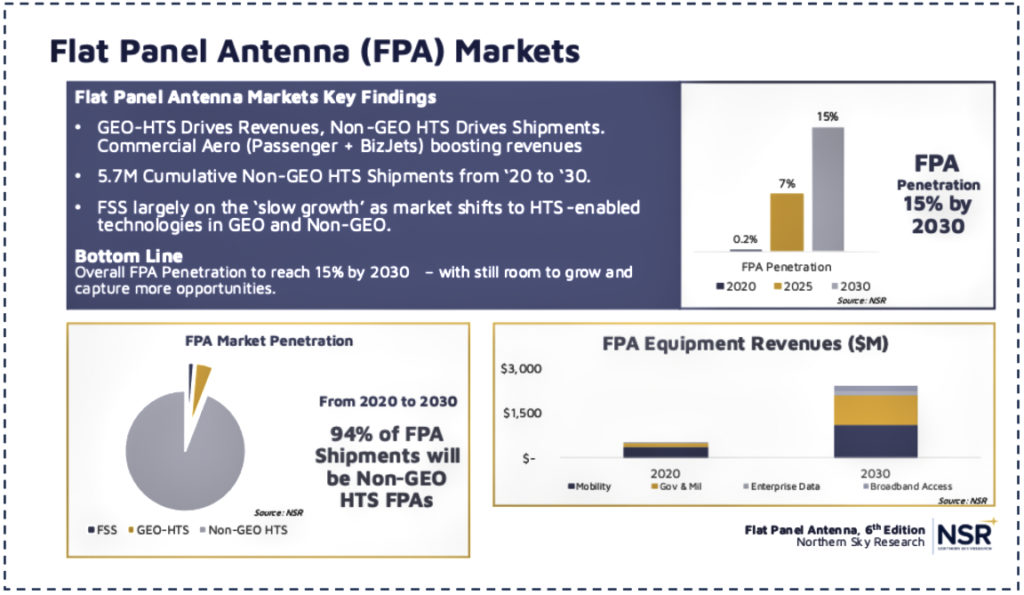 OneWeb is working with a selection of antenna manufacturers to target different verticals. In collaboration with Intellian, they created the smallest flat panel antenna to connect with their LEO constellation, serving enterprise and government customers in 2022. Other antenna vendors and satellite operators also continue to announce a mix of FPA solutions across the range of end-user markets they are targeting.