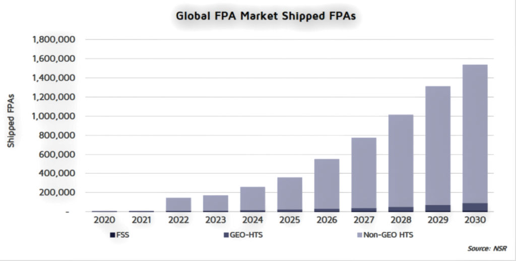 Over the next years, shipped FPAs will go from single thousands to into hundreds of thousands. The majority of those, 94% of 2030 shipped FPAs, will be Non-GEO. Of that, a large chunk of will be for Consumer Broadband which is driven by Space X, where they are still pushing things to lower the production cost with 50% by the end of the year whilst scaling up production of their terminals. GEO or LEO, or both?
