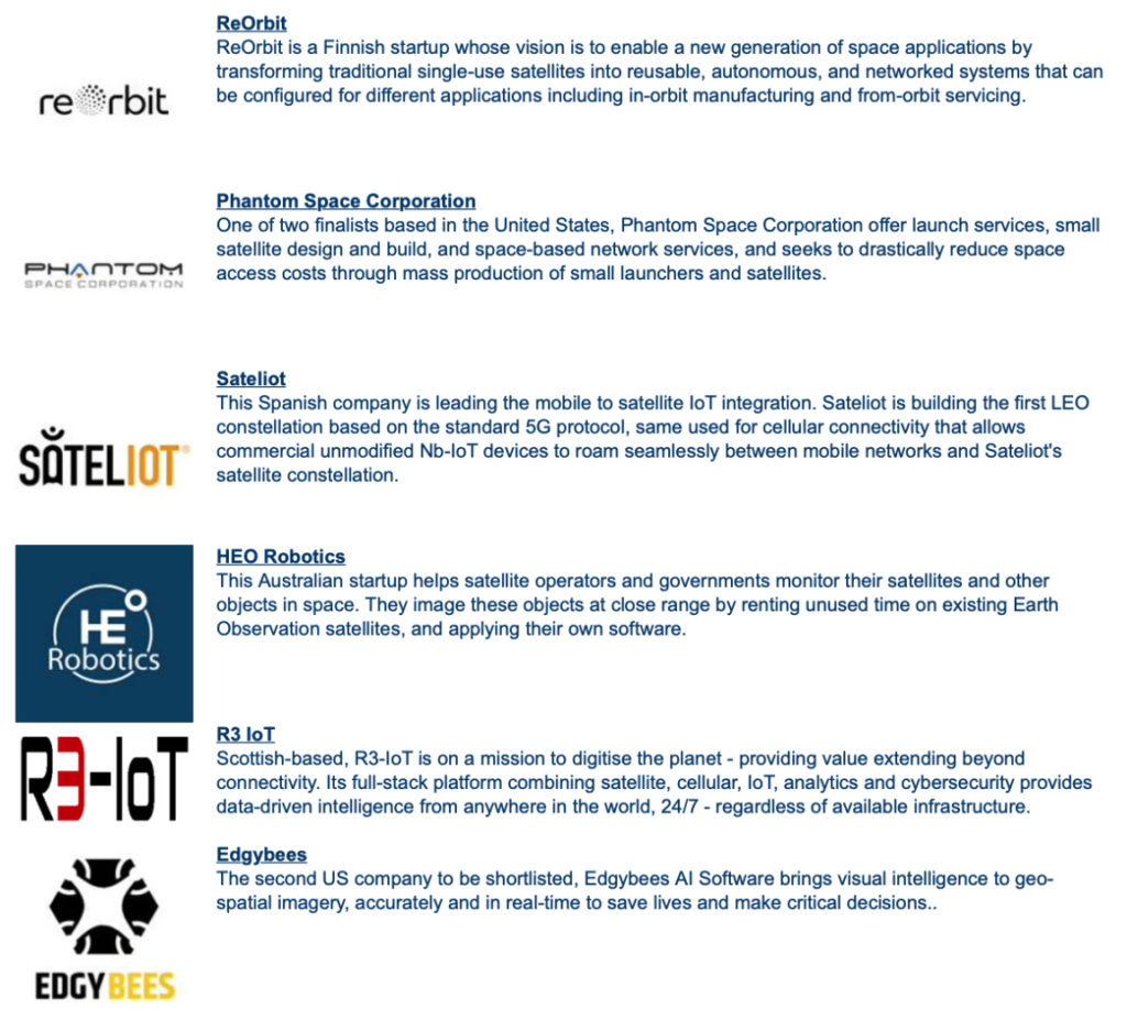 Of the six finalists, two companies will receive a Finspace award. One will be awarded for Satellite Financing, and one for Earth Observation. The six finalists are:
