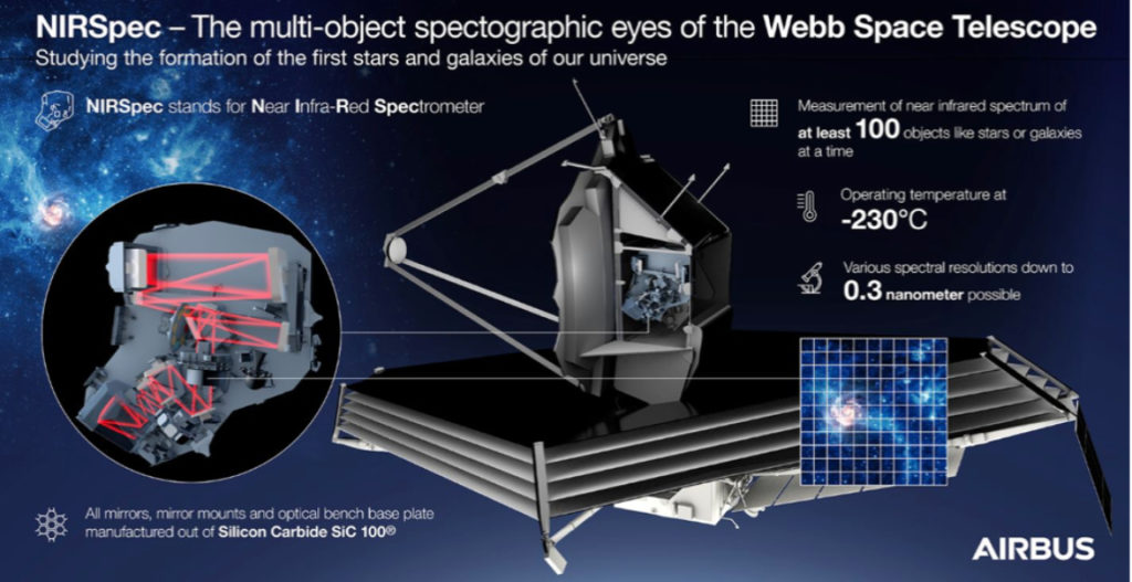 One of the four instruments in the scientific suitcase is the Near InfraRed Spectrograph (NIRSpec) built by Airbus in Germany.