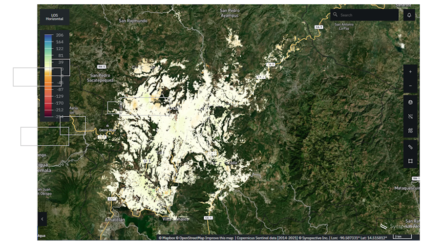 As a general trend in Guatemala City, localized subsidence phenomena and areas that show sinkage and landslide risks have been identified. The figure below shows that the maximum subsidence area fluctuated by about -292mm and the maximum uplift area fluctuated by about +88mm.