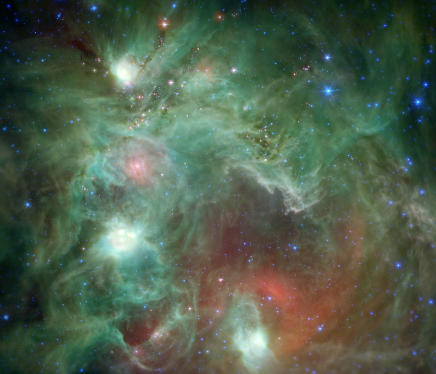 Scores of baby stars shrouded by dust are revealed in this infrared image of the star-forming region NGC 2174, as seen by NASA’s Spitzer Space Telescope. Some of the clouds in the region resemble the face of a monkey in visible-light images, hence the nebula’s nickname: the “Monkey Head.” However, in infrared images such as this, the monkey disappears. That’s because different clouds are highlighted in infrared and visible-light images.