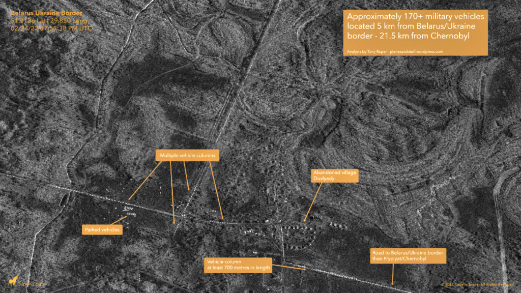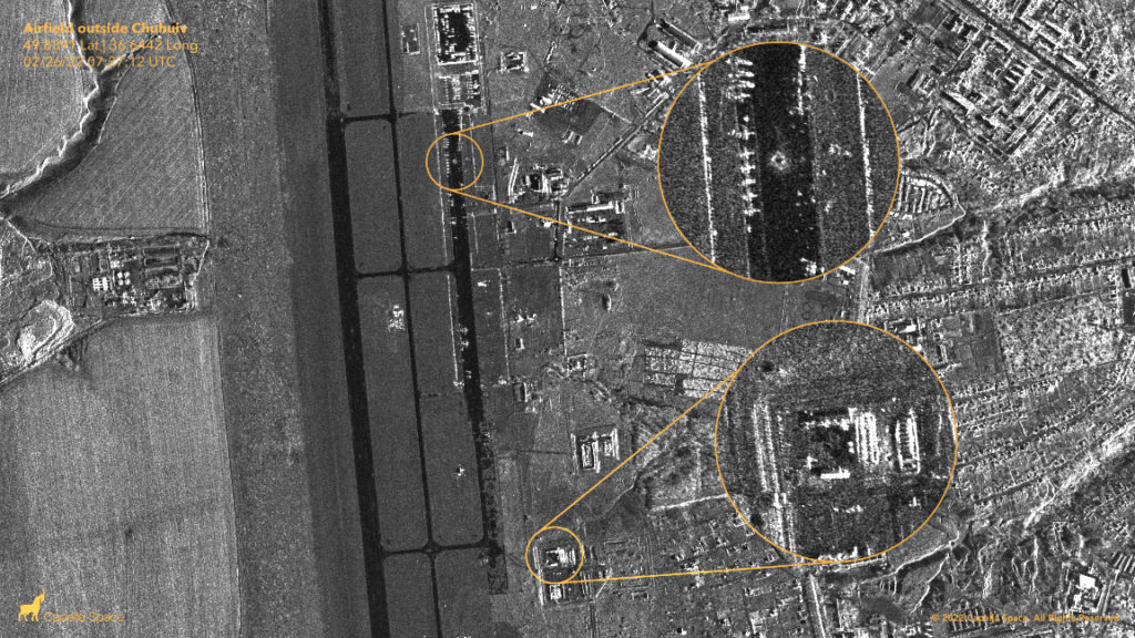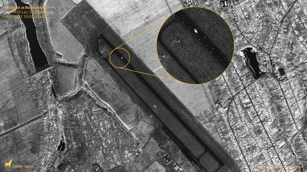 Capella Space has captured SAR imagery are from the airfield at Rodnykivka (48.7932 LAT, 30.2086 LONG – captured 2/26 at 10:05 am UTC) in the Ukraine.