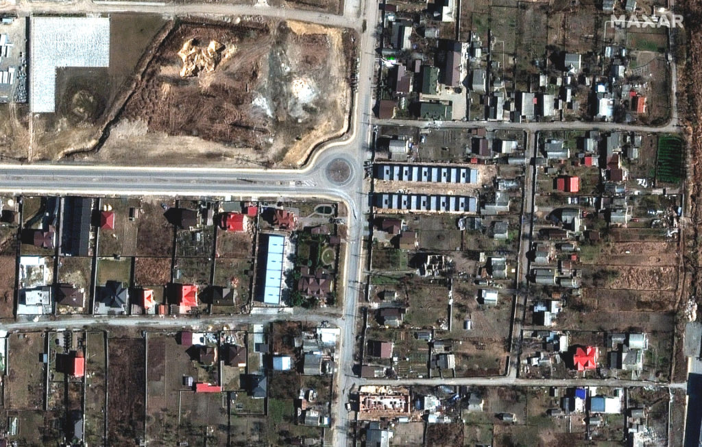 Additionally, Maxar satellite imagery verifies reports and photos that a mass grave has been established on the grounds of the Church of St. Andrew and Pyervozvannoho All Saints.