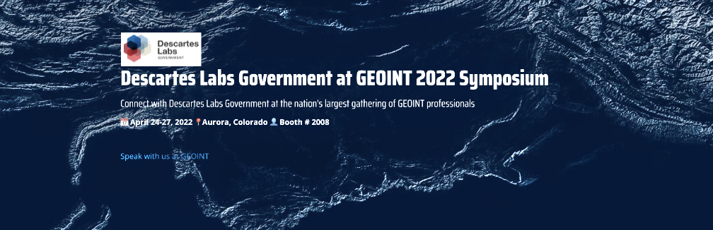 Descartes Labs Government’s presentations are open to all GEOINT 2022 attendees; however, the training workshops require advance registration and a small USGIF fee. GEOINT 2022 will be held April 24-27, 2022, at the Gaylord Rockies Resort & Convention Center in Aurora (Denver), Colorado.