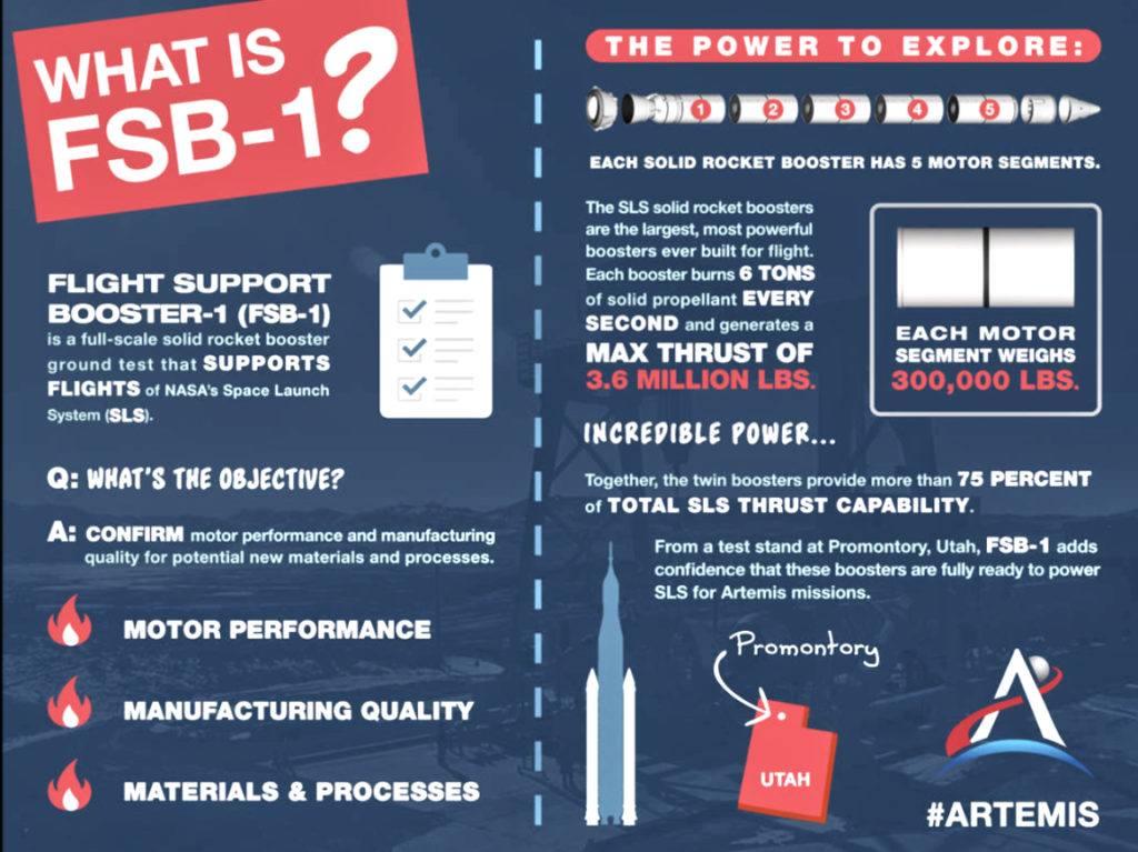 The five-segment solid rocket booster for NASA’s SLS rocket tested for early learning in support of next-generation systems at Northrop Grumman’s Promontory, Utah, test area. Over 300 measurement channels assessed the 154-foot-long solid rocket booster as it fired for just over two minutes producing upwards of 3.6 million pounds of thrust. This test evaluates new materials and demonstrates a new motor ignition system and an electronic thrust vector control system that steers the motors to provide data for the development of the next-generation Booster Obsolescence and Life Extension (BOLE) boosters.