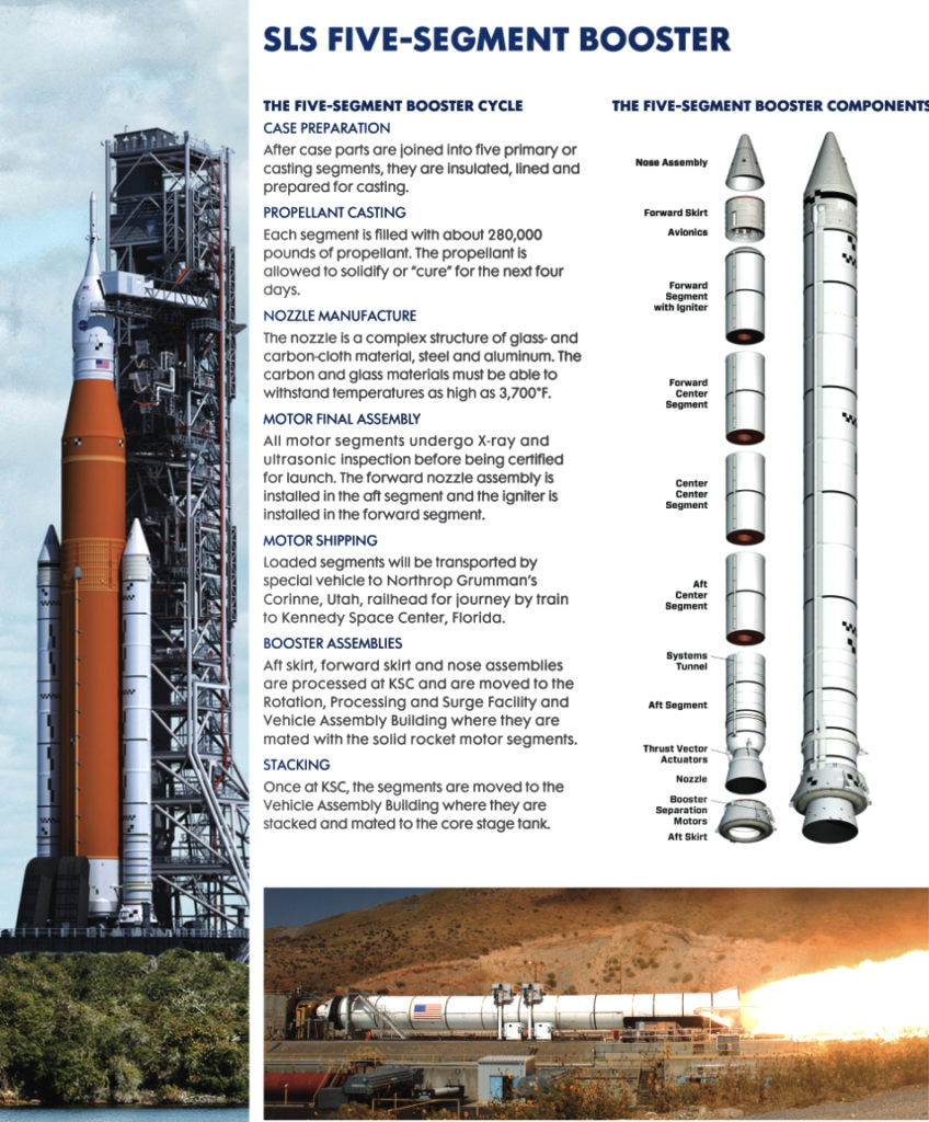 Northrop Grumman has supplied rocket propulsion for NASA’s Apollo and Space Shuttle Programs and developed the five-segment SLS solid rocket booster based on the flight-proven design of the space shuttle boosters. Designed with an additional segment and upgraded technology and materials, each of the twin solid rocket boosters generates 25 percent more thrust than its predecessor boosters to aid the SLS rocket’s ability to deliver greater mass and volume to space with greater departure energy than any existing launch vehicle.