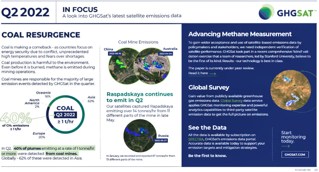 This is GHGSat‘s Q2 report on the latest satellite emissions data. This report highlights the loss of money O&G companies and organizations experience when they leave a leak unattended. There is also an entire section dedicated to updates in the coal mining industry.