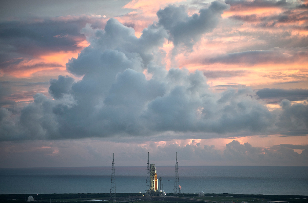 ORIGINAL POSTING The NASA Artemis I moon shot has been postponed, due to a problem with one of the Space Launch System‘s (SLS) rocket engines. (Above: A sunrise photo of Launch Pad 39B at Kennedy Space Center with the SLS rocket + the Orion spacecraft waiting for the launch earlier today. Photo is courtesy of NASA / Zoel Kowsky.)