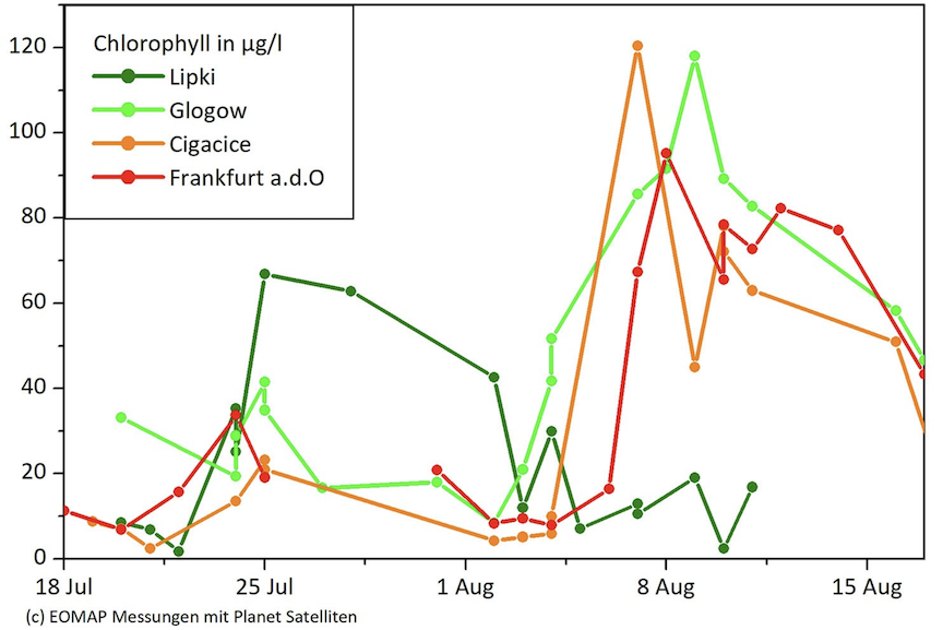Three-to-five-meter Dove satellites image the entire Earth’s landmass each day, providing a more frequent capture than Sentinel-2 used so far. The 3m resolution allows for a much higher level of detail that was particularly relevant to assess the narrower river areas of the Oder. Paired with the European Sentinel data, the detailed course of the algae bloom from Lipki to the mouth of the Oder River has now been determined. Thus, the team of EOMAP, German specialist for satellite-based environmental data of water bodies, was able to show the following on eight river sections between Lipki (Poland) and the Szczecin Lagoon (Germany): “The algal bloom’s greatest extent was – depending on the river section – already between August 4 and 7, much earlier than previously thought. A previous algal spill at a lower intensity was already visible around July 24 15 km south of Wroclaw but then increased to double its extent around August 3 near Glogow,” reports Dr. Thomas Heege, CEO of EOMAP.